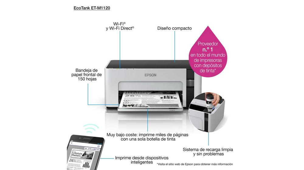 Disfruta de las ventajas de la impresión móvil y grandes ahorros con este modelo EcoTank duradero, rápido y energéticamente eficiente con depósito de tinta rellenable. Esta solución rentable te permite imprimir hasta 5000 páginas la tinta negra incluida1. Obtendrás las copias rápidamente, ya que no hay tiempo de encendido y gracias a una velocidad de impresión de 15 ppm2. Conéctate fácilmente mediante Wi-Fi y usa la gama de aplicaciones de impresión móvil de Epson.